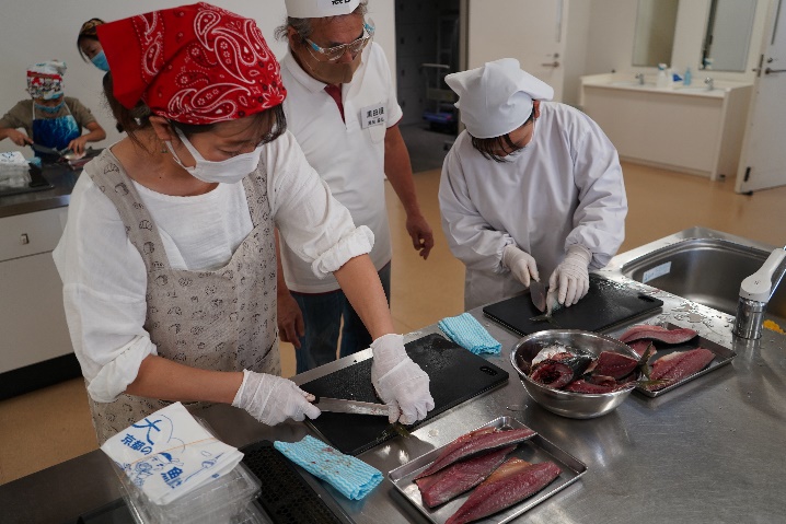 塩竈市魚市場の魚食普及スタジオ「さばける塾」を開催。サバのさばき方を学び、味噌煮や重ね焼きを作りまし...