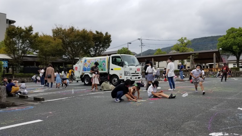 ごみ収集と大きな自然の循環について考えるワークショップを行い、ラッピングの絵をデザインしたごみ収集車...