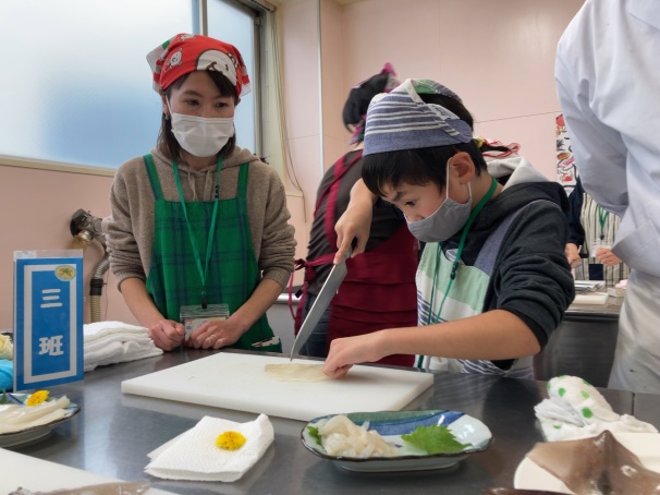 北海道中央調理技術専門学校で「さばける塾」を開催。イカをさばいた後に刺身やホイル焼きを作り、試食をし...