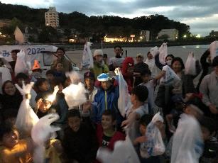 日本丸をブルーにライトアップして海ごみゼロを訴え、ラジオの公開生放送を行うイベントを開催。日本丸メモ...