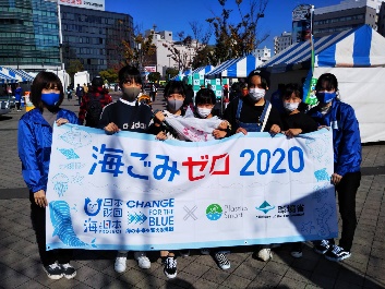 会場周辺ではCHANGE FOR THE BLUE in大分のジャンパー・マスクを身に着けたキャラバン隊が、ごみ拾いの呼びかけと海洋ごみ削減の啓発を訴えました。好天に恵まれ会場は人通りも多く、1万人強の人手で賑っており、家族連れを中心に多くの方々にごみ拾い・分別にご協力いただくことができました。ブースにはプラスチックごみと海の関係や、今日からできる海をキレイにする3つのルールなど多くのパネルを掲出し、会場の皆様にご覧いただきました。