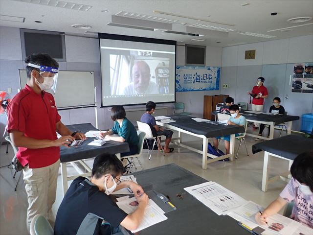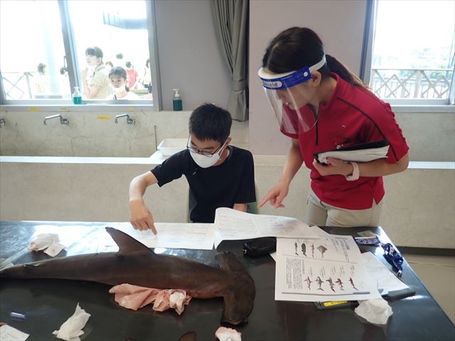 サメ解剖教室は、観察(撮影・スケッチ)、大きさを測る(計測)、種類を調べる(査定)、解剖を、当初サメ先生として知られる 仲谷一宏北海道大学名誉教授に直接指導をしていただく予定でしたが、新型コロナ感染症対策でウエブ会議システムを利用したオンラインで指導をしていただき、会場では当館の飼育職員が指導する方法に変更して実施しました。