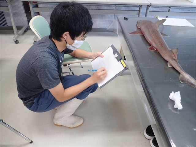 一人に1匹のサメを渡し、魚体のクリーニングをしました。撮影班とスケッチ斑に分かれ、撮影とスケッチで外部形態を記録しました。