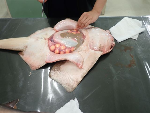 内臓器官を観察するため、解剖を行いました。まずは、ハサミで腹部を切開し、各臓器の位置等を確認しました。