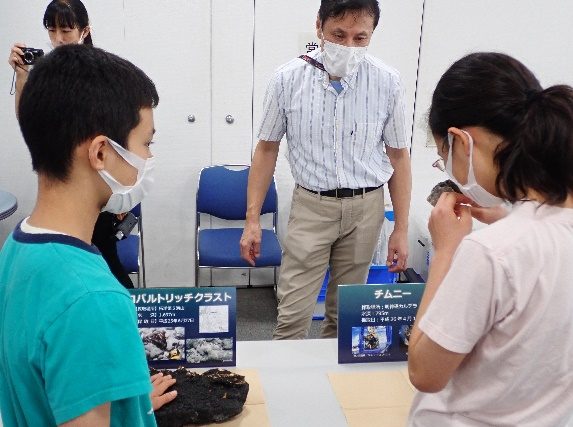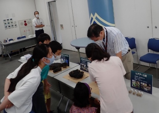大型観光バスで、千葉市科学館からJAMSTEC横須賀本部へ行き、JAMSTECで今回新たに企画された、JAMSTEC学習プログラムを体験しました。午前中は、JAMSTECの紹介と海洋資源の講義、午後は研究棟の見学と、有人潜水調査船「しんかい6500」や深海調査のための機器の見学、展示室の見学をさせてもらいました。午前中の講義では、チムニーやマンガンノジュール、マンガンクラスト、レアアース泥などの実物を見たり触ったりさせてもらい、とても興味深く観察して、不思議に思ったことなどを積極的に講師の鈴木勝彦先生に質問をしていました。大陸の石(花崗岩)、海洋地殻の石(玄武岩)とマントルの石(かんらん岩)を重液に入れ、大陸がマントルの上に浮いていることを構成する石の比重の違いから見せる演示実験では、石が液体に浮き、しかも浮き方に違いがあることが目に見えてわかり、子ども達も不思議に感じて興味を持った様子でした。また、海洋地殻の石はネオジム磁石で動く=磁気を帯びていることを、一人ずつ確かめさせてもらったりと、不思議な体験をたくさんさせていただきました。