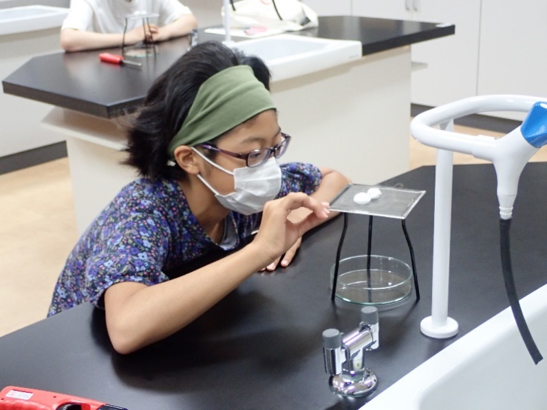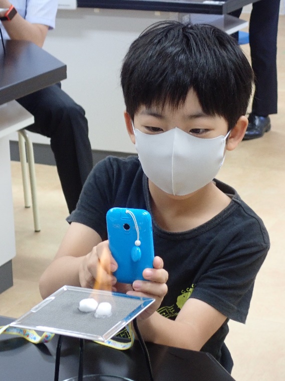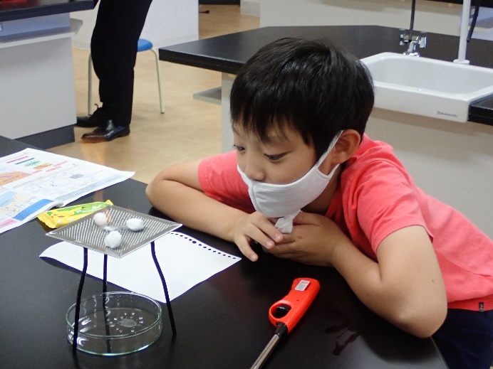 今回の燃焼実験には、戸丸先生に人工的に作っていただいた人工のメタンハイドレートを使わせてもらいました。また、海底から採取したメタンハイドレートの実物も見せてもらえたので、自然にできたものと人工のものと比較して、色の違いや匂いの違いなどに気づいて質問したりしていました。匂いは温泉のような匂いで、それは硫黄の匂いで、そのまま燃やすと有害な物質ができることも教えてもらいました。また、メタンが二酸化炭素の20倍もの温室効果をもつことも教えてもらい、とてもおどろいていました。地球温暖化の話は、小学5年生でも関心があるようでした。燃やす前に、実際に触ってみようということで、最初は恐る恐る触っていましたが、思いの外それほど冷たくないということがわかり、どんどん触って、どんどん燃焼させて、燃焼の様子を観察したり、燃焼後に水が落ちている様子を観察したりしていました。メタンハイドレートが溶けてメタンのまま放出されるより、燃焼させて二酸化炭素にした方が温室効果としては抑えられることを知ったからか、戸丸先生が用意してくださった人工のメタンハイドレートを、すべて燃焼させて、その様子を写真に撮ったりして、とても楽しそうに実験をしていました。