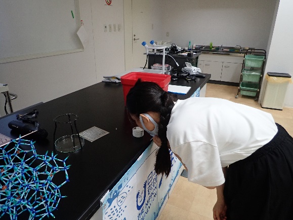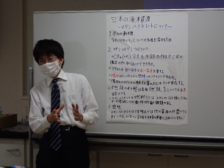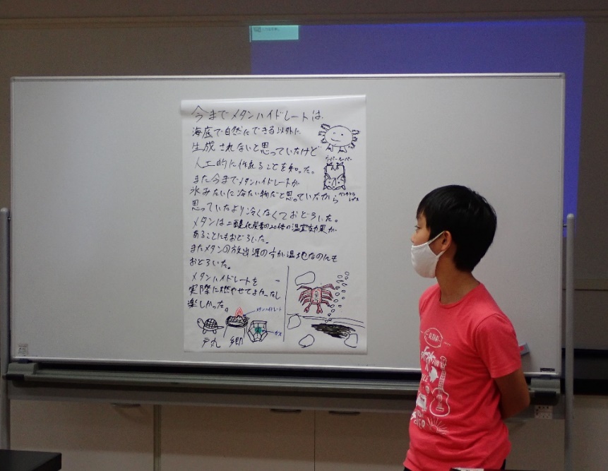 最終日は、千葉市科学館8階科学実験室Aにおいて、午前中は千葉大学大学院理学研究院の戸丸仁准教授のメタンハイドレートの講義と燃焼実験、午後は引き続き戸丸先生の講義の後、これまでのまとめを書いて、一人ずつ発表をしました。この日は高校の先生2名も実験に参加して、午後のまとめと発表にも一緒に加わってもらいました。