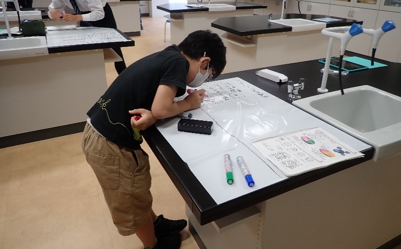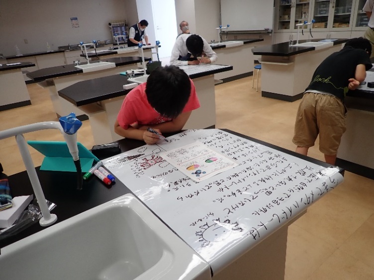 午後のまとめでは、これまでに知っておどろいたことや楽しかったことなどをホワイトボード用紙に書いてまとめ、それを使って発表をしました。まとめの時間が足りないくらい、たくさんのことを書いて、一生懸命発表してくれました。それぞれが感じたことが違い、お互いの発表を聞いて、なるほどと思うことも多かったです。