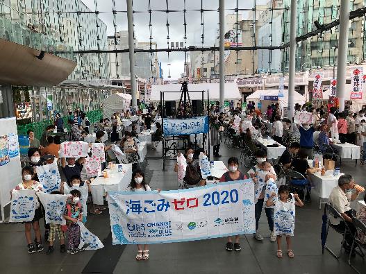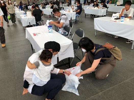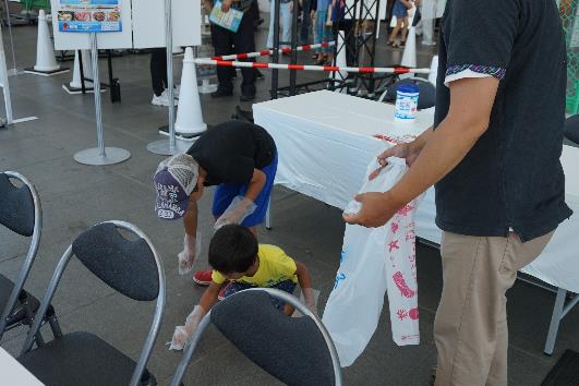 開催期間中、会場入口で来場者に海ごみゼロオリジナルごみ袋に配布し、会場内・付近のごみ拾い企画を実施。丼ぶりを購入する前や食事を終えた後にごみ拾いを実践する人が多くみられました。
