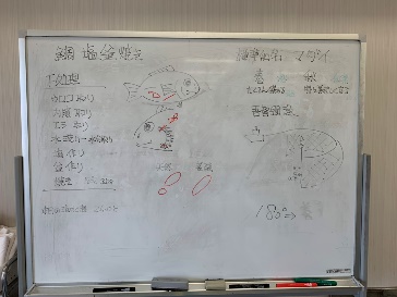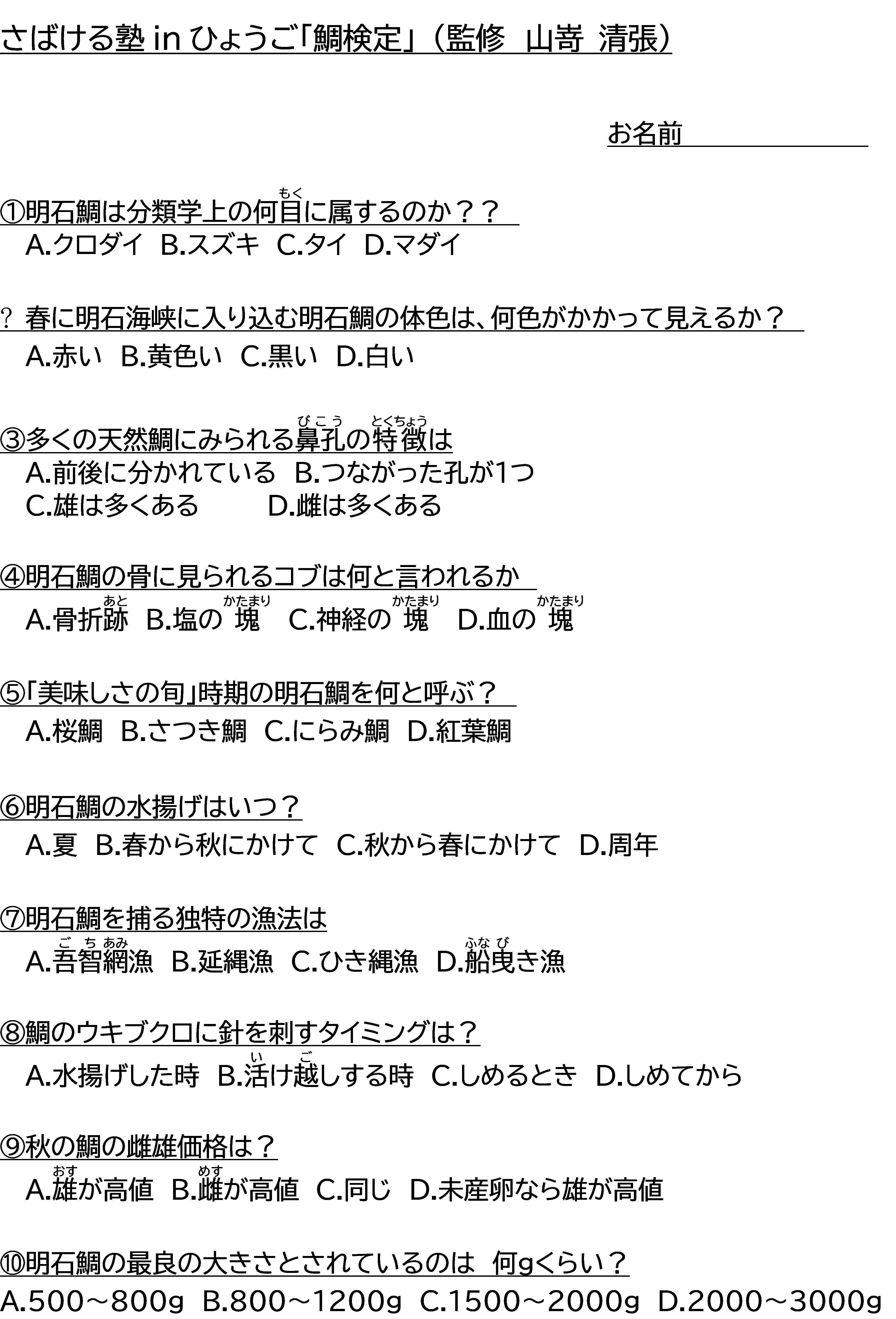 お魚語り部の山嵜先生より、明石海峡の地形についてや今回の新型コロナウィルスの影響による養殖魚がおかれた状況、海洋プラスティック問題などの説明を受けた後、山嵜先生監修の「鯛検定」に挑戦しました。(山嵜先生は明石で行われている「タコ検定」を監修されています)