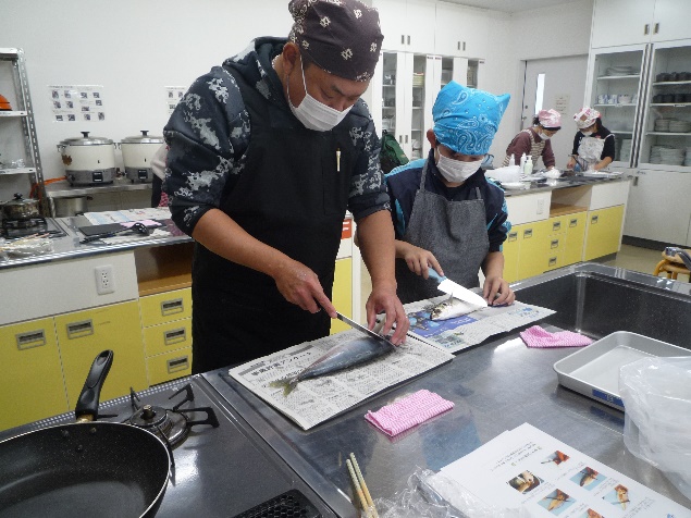 そのあと、大阪ガスクッキングスクールインストラクター 4名が講師となり、アジのさばき方をデモンストレーション。これを見たあと参加者が1人1匹ずつアジをさばき、さばいた魚で調理して食べました。