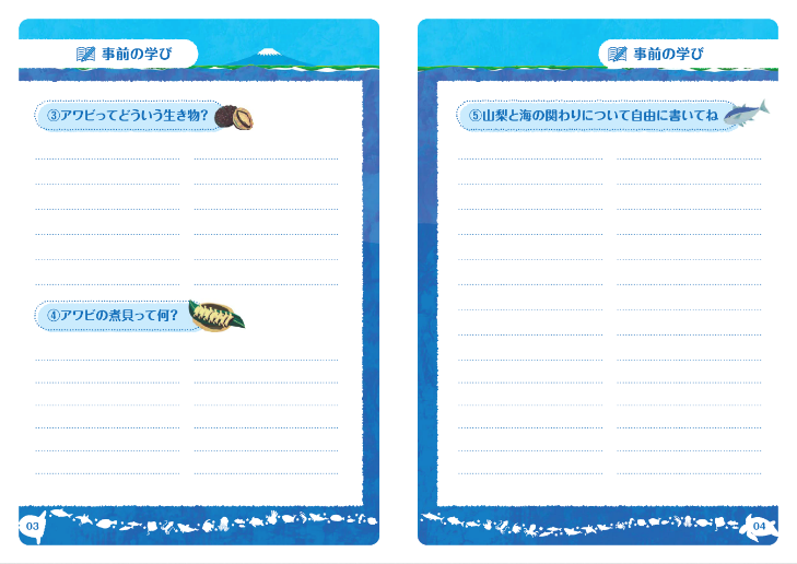 気象予報士や、山梨県立博物館、静岡県水産技術研究所伊豆分場、信玄食品などから専門家を講師に招き、山梨の子どもたちへ特別な学習機会を提供。地元の特産品となったアワビの煮貝などにも触れながら、海との歴史的な関わりを紐解きました。