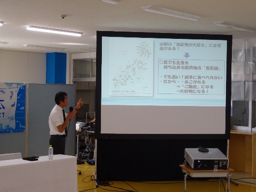 山梨と海との関わりを山梨県立博物館の森原明廣学芸課長に解説いただきました。講演では、山梨県民がなぜ昔から今にわたって海産物が好きなのか、駿河湾で獲られた海産物をいかにして山梨県まで運んできたのかなど歴史的資料を用いながら解説いただきました。