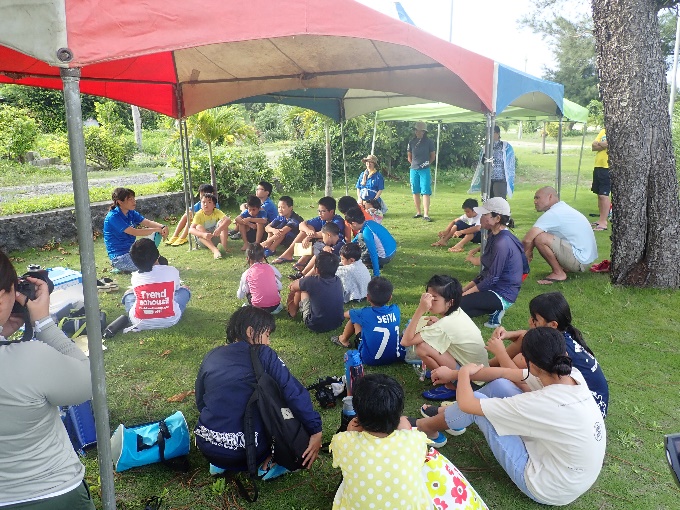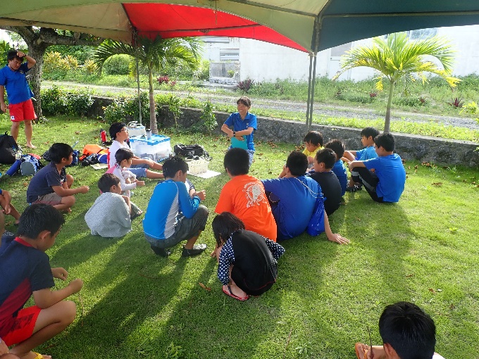 陸に上がり、事後学習を行いました。観察した海の様子やサンゴ、海の生き物の様子を子供たちと共有。与論島の海はサンゴを中心として生態系が育まれていること、サンゴがなければたくさんの海の生き物たちが存在しないことを認識し、今後の海遊び・海の観察においても、自分たちが海の中に「お邪魔している」ことを念頭に置きながら海遊びをしていくことを伝えました。