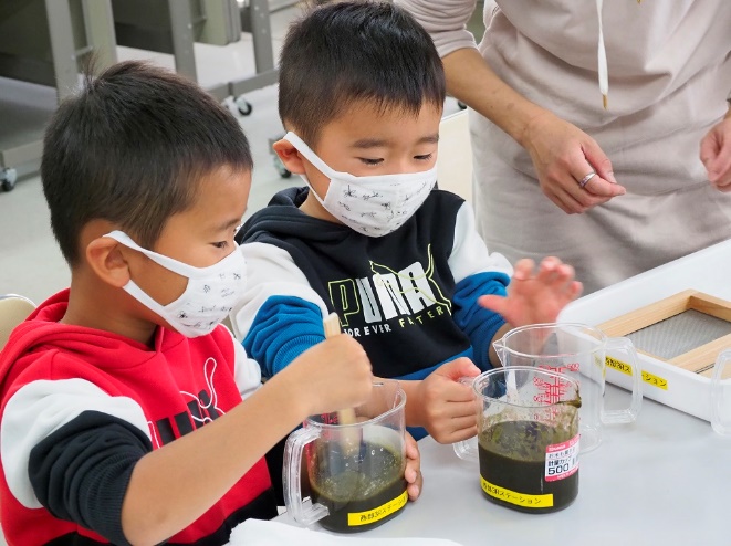 アオサの有効活用法を探るため、アオサでによる紙すきを実験。海洋プラスチックごみについても考えました。...
