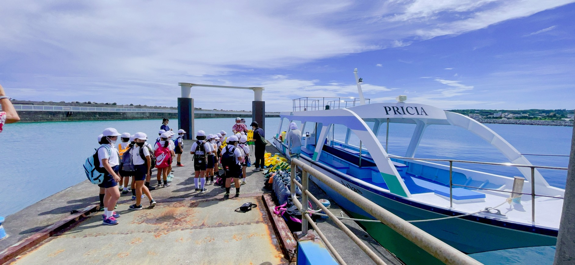 サンゴについて事前学習を終えた後、いよいよグラスボートに乗船してサンゴ礁を観察しました。今回、グラスボートの操船を担当してくださったのは、総合リゾート施設「プリシアリゾートヨロン」の方です。乗船直後の海はまだ浅く、死んでしまったサンゴのガレ場があり、サンゴ礁のリーフの外側に出ると一気にたくさんのサンゴを見ることが出来ました。過去には浅瀬でも多くのサンゴを見ることが出来ましたが、現在は深場まで行かないと見ることが出来なくなってしまったサンゴ。サンゴ礁を大切に想いながら、普段の生活を送ってもらえたらと思います。