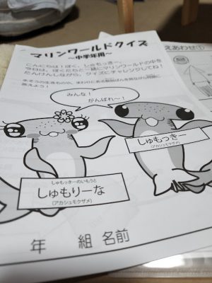 コロナ感染が収まらず、水族館へは行かずに、オンラインで「マリンワールド海の中道」のサイトに接続し、飼育員さんのお話しや海の生物の現状などを学びました。さらにマリンワールドが発行している海のクイズに挑戦しました。