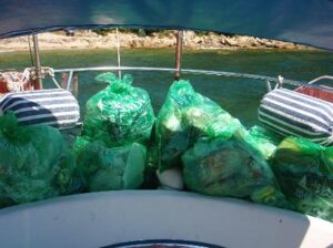 海浜を覆い尽くす流木等はかまどを組んだ火起こしとBBQで毎回かなりの量を利用します。人が出したプラスチックなどの燃える海洋ごみを回収しています。船に積んで持ち帰るので、毎回45L袋で10袋程度ですが、無人島キャンプの回数を重なるほどに海浜がきれいになっていきます。回収して持ち帰った燃える海洋ごみは、後日スタッフが淡路市の焼却場へ車で運んで処理をしています。