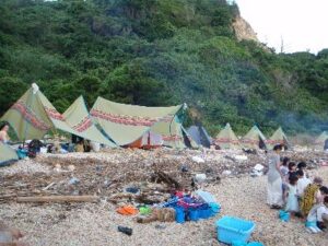 無人島キャンプは2018年から続いています。大切にしていることは海と環境の現状を伝えることです。無人島キャンプで利用する鞍掛島ですが、利用するシーズン初めは漂着した海洋ごみと流木で海浜は覆われていることに参加者の皆さんは驚かれます。今年6月は淡路島を出発して瀬戸内海を抜けて対馬まで往復したのですが、瀬戸内海の無人島の海浜はどこも漂着した海洋ごみで溢れかえっています。玄界灘の宗像大島、壱岐島、対馬の海浜でも多くの海洋ごみを見ました。瀬戸内海の海洋ごみは99%が日本のごみです。スタッフが知る海洋ごみの情報を参加者に伝えて毎回活動後にはビーチクリーン活動を実施しています。