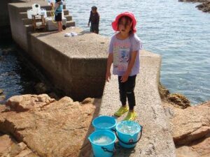 森のようちえんまんまるの所属のご家族は当法人の魚釣りや無人島のイベントに参加するようになってから釣りブームになっているそうです。竿は流れついた流木等をつかい竿を作ったり、エサは貝を採って石で潰して身を針に指したり、無人島の環境を最大限に利用して魚釣りを楽しんでいました。ベラなどの小魚がたくさん釣れたので、かまどを組んで火起こしをして、魚を竹串に刺して焼いて食べることまでのすべての工程を子どもたちだけでやり遂げていたことには、日頃の活動の成果だと思いますが、とても感心させられました。