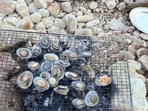 この日のすごいと感じたことは貝類をたくさん採って食べたり魚釣りに利用したりできたことです。近年、磯焼けの原因となり海底を真っ黒に埋め尽くして害といわれるガンガゼやムラサキウニですが今年は少なく感じます。その影響なのか身の入りが多いのです。例年、耳かきほどの量しか入っていないのですが、小さなスプーンですくえるほど身が入っているのです。大人の皆さんが大喜びで海に潜って数十個のウニを採り食べ続けていたことが印象に残りました。子どもたちは磯場で貝採りをして、貝を石で割って魚釣りのえさにして、ベラなどをたくさん釣っていました。釣った魚は子ども自身が調理して塩焼きで食べました。大人も子どもたちもとてもたくましく無人島で過ごしていることにスタッフ達は今年も驚かされました。