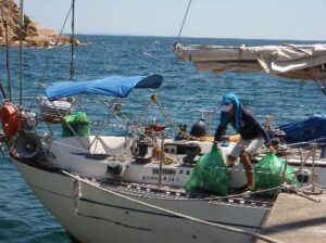 9月の平日開催ですが、森のようちえんや多文化共生ヒッポファミリーのご家族が仕事の都合をつけて、たくさんの方が参加してくれました。9/21帰港後に係留するヨットの船尾からかごを仕掛けて、9/23出航前に引き上げると真たこが2匹入っていたので、参加者に披露して無人島の食材として持っていくことになりました。今回は淡路島海鮮料理屋名店いちじろうの大将もスタッフとして参加し、2匹の真たこを調理。参加者もスタッフも勉強になったことは真たこのぬめり取りです。レシピでは大量の塩を使うことが定番ですが、大将はコンクリート桟橋の床で真たこを揉んで、次に魚採り網の網の部分でぬめりを取りました。あとは真たこを解体して皮を剥いて刺身を作りました。保護者の皆さんは大将のテキパキした調理に見入って、スマホで撮影したり、最後は拍手を送っていました。