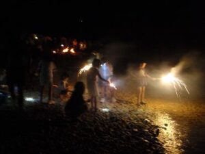 淡路島では焚き火ができる場所はほとんどありませんが、泊まりキャンプでの楽しみは開催回数を重ねるうちに増え、多くのプログラムを落ち着いて取り組めること、テント設営、花火、焚き火、星空観察などができるようになりました。また、花火でさえ公園や小学校でもできる場所がなくなっており、花火は市町村が開催する行事を眺めるものになってしまっています。無人島の浜辺でかまどを組んで火起こしをすることや手にとって自ら花火を楽しむことは大切な体験です。火を扱うことの安全対策も話をしていますので、実体験を通して身につくものだと感じます。子どもたちが寝た後の大人だけの焚き火の会では、子育てに関して現役の保護者の皆さまから様々な悩みや話し合い、相談があったりと貴重な時間を過ごすことができました。