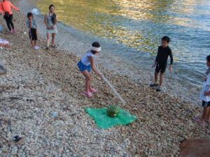 人気のプログラムのひとつがすいか割りです。海に浮かべて冷やしたすいかが潮の干満差で浅くなったり深くなったりするので、子どもたちはすいかを見守ってくれます。月の位置を知ることから月の引力で潮の干満が起こることも教えることができるので、単純なすいか割りも毎回子どもたちは一喜一憂におはしゃぎで盛り上がります。保護者の感想から「スマホが使えない環境で子どもたちが楽しめること」に感謝されることがよくありました。