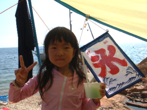 公募でのキャンプは初めましてのご家族ですが、出航前の荷物の積み込み、無人島に着いてから荷物の運搬など皆さん率先して動いてくれるので、毎回気持よく運営ができています。7月下旬の初めての泊まりキャンプで猛暑に対して参加者もスタッフも熱中症の心配がありました。以降は特大のクーラーボックスに大量の氷、凍らした500mlのペットボトル、かき氷セットなど熱中症対策も重点項目に入れています。ヨットで往路の時間では、船長体験を開催しながら、船内の2台の電動かき氷器を使って子どもたちが乗船者全員にかき氷の注文を聞き、かき氷を作って配ります。また、無人島滞在時の1日目の午後と2日目の昼前にも、のぼりをぶら下げて子どもたちがポータブル電源を活用してかき氷屋を開催。この夏とても厳しい猛暑のなか無人島キャンプを乗り越えられたのは氷の力だと感じます。今回は最年少1歳のお子さまの参加がありましたので、船内エアコンを付けたままにしてヨット船内をお昼寝の場所として提供しました。