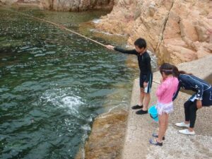無人島に着くといつものように子どもたちは海水浴、シュノーケリングなどを楽しむために海に入っていきます。今回は透明の小さなクラゲ(アンドンクラゲ)がたくさん漂着していたようでラッシュガードなどを着ていない子どもたちはチクチクしたようです。そんな影響もあり今回は魚釣りが人気でした。浜辺に流れ着いた長い木を拾ってハリスと針と重りをつけて、貝を採って割って身をエサにして、無人島ならではの魚釣りを楽しみました。9月に入ってからは魚も少しずつ大きくなってきていて20cm近いベラもたくさん釣れたので、うろこ取りと内臓を取って魚の姿のままくし刺しにして塩焼きで食べました。