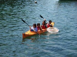 毎回ヨットのデッキ上に2.5名乗りの14ftのカヤックを1艇積んで持っていきます。この日はカヤックを取り合うほどの人気でした。最後には幼児4名がカヤックに乗り込んで、「いち、に~」「みぎ、みぎ」などと声を掛け合って漕いでいました。スタッフはいつでも飛び込んで支援に行けるように岸壁の上から見守っていましたが、子どもたちだけ操船して浜まで戻ってきたことには感動しました。保護者からは幼児だけでこのような体験をさせてもらうのはとても貴重で子どもたちも自信になっていると思いますと感謝の言葉をいただきました。