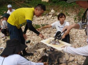 8/10は、この小さな無人島に私たちが約30名、団体名無人島プロジェクトの大人だけの参加者が約40名、個人の2家族7名、テントは20張となり超過密となりました。私たちから他団体と他ご家族に声をかけてビーチクリーン活動を実施。無人島利用者のほとんどがかまどや炭はそのままでごみとして残して帰り、またキャンプ用品が安く購入できることから、BBQセットや鍋なども残して帰る人までいます。年に何度かは無人島で火の気が残っていると通報があり、島の役場の人が船で消しに行くこともあると聞きます。今回、合同でビーチクリーン活動を実施したことは役場にとっても効果的で有り難いことですと感謝されました。