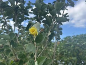 台風一過、爽やかな秋晴れの中、参加した小学生は好奇心に溢れ、清野准教授の説明をよく聞き取っている様子で、すぐにハマボウの種を見つけて見せに来てくれました。ハマボウだけでなく松の葉で引っ張りあいっこしてどっちが強いか、という昔遊びをスタッフに教えてもらうと直ぐに夢中で遊び始めました。今年の夏はとても暑い日が長く続いたためハマボウの紅葉は進んでいませんでした。そんな中で遅咲きのハマボウの花が数輪咲いていました。ハマボウの花は朝咲いて夕方しぼむ1日花です。夏の大きく開いた花に比べるとやや小さく、それでも元気を振り絞るように逞しく咲く姿に参加者の皆さんも感動しました。