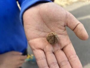 台風一過、爽やかな秋晴れの中、参加した小学生は好奇心に溢れ、清野准教授の説明をよく聞き取っている様子で、すぐにハマボウの種を見つけて見せに来てくれました。ハマボウだけでなく松の葉で引っ張りあいっこしてどっちが強いか、という昔遊びをスタッフに教えてもらうと直ぐに夢中で遊び始めました。今年の夏はとても暑い日が長く続いたためハマボウの紅葉は進んでいませんでした。そんな中で遅咲きのハマボウの花が数輪咲いていました。ハマボウの花は朝咲いて夕方しぼむ1日花です。夏の大きく開いた花に比べるとやや小さく、それでも元気を振り絞るように逞しく咲く姿に参加者の皆さんも感動しました。