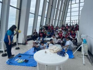 午後の部は、園内の施設にて「海洋ごみから海の生き物を守ろう!」をテーマに九州大学うみつなぎ統括プロデューサーの清野聡子(九州大学工学研究院准教授)による講話を行いました。