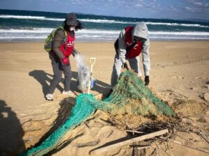 海岸清掃グループは、砂に埋もれてしまった漁網や、海を漂い流れ着いた冷蔵庫など、春の時には対応できなかった大型の漂着物の回収にも着手することができました。わずか30名ほどの人員でしたが、この日だけで90L袋で42袋分、180Kgの人工ごみと、漁業用フロートなどの大型ごみ10点を海岸から取り除くことができました。
