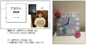 イベントの締めくくりとして、今回のイベントで海やウニについて学んだことをレポートやアートとして表現してもらい、一堂に展示して皆で作品を鑑賞しあうというオンラインコンテストを冬休み期間の2024年12月25日から2025年1月10日まで開催しました。今回出品された参加者の保護者から「工作で参加できて良かったです。小2で実験に失敗して落ち込んでいるところに活躍の場があって良かったです。ありがとうございました!」という声があり、コンテストにはそのような役割もあったのかと再発見することもできました。このコンテストでは参加者間投票でグランプリ作品やその他の賞を決定します。また投票の際には作品へのコメントも一緒に集め、そのコメントを出品者に伝えることで再度、参加者間の交流を行いました。
