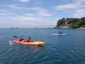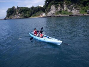 先生や友達と協力して自分の手でカヤックを漕ぎます。海の上で、波の音を聞き風を感じ水に触れることで自然を体で目一杯感じることができました。レスキュー艇2艇に加え、インストラクター3名以上でのアテンドのため安全な海遊びを体験していただけました。