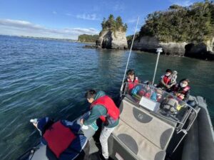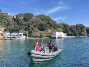 小型のボートで小網代湾の奥までクルージングします。小網代湾の奥には約17ヘクタールほどの大きさがある小網代の森が広がっており、その森を海側から観察しそこで生きる生き物の解説を行いました。さらには湾を抜け外洋に出て、海の広さや風の強さを感じて自然と触れ合いました。