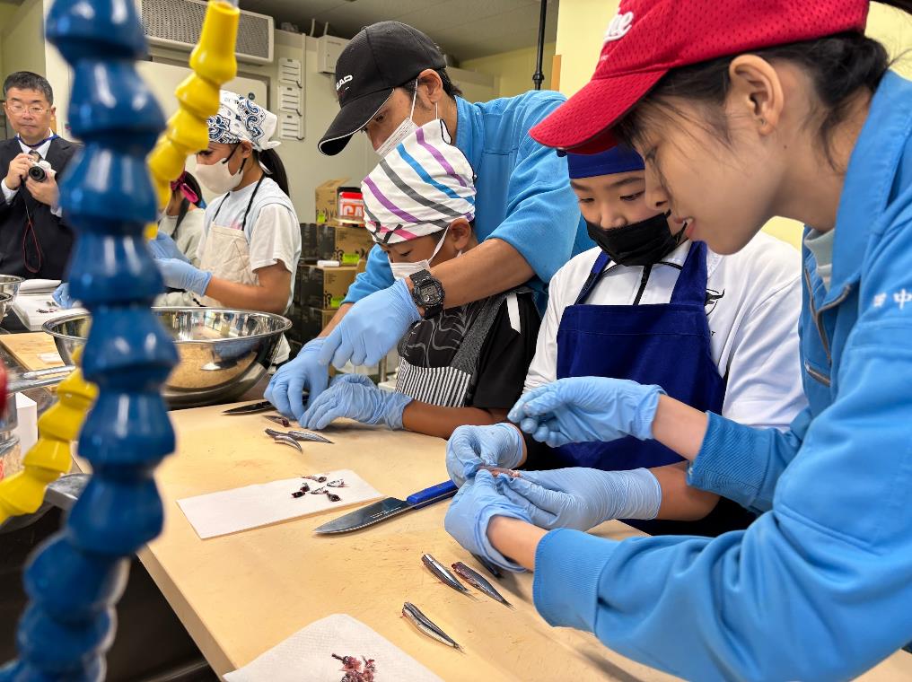 捌き体験では、子ども達は、FUKUNOTANEで働くベトナム人とインドネシア人のスタッフに魚の捌き方を教わりながら、初めての「きびなご捌き」を体験しました。