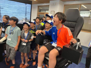 2日目は男鹿海洋高校内にある「風と海の学校あきた」で地球温暖化の原因やその影響、再生可能エネルギーについて学習と洋上風力発電でのメンテナンスを行う船の操船体験をシュミレーター機器を使って行いました。