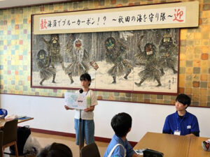 「あきたの海を守り隊」が向かったのは、男鹿市の「男鹿水族館GAO」です。最初に秋田県水産振興センターの加藤雄平さんから話を聞き、秋田の海と魚介類、ブルーカーボンについて学びました。