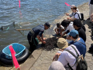 今回の特別列車は途中降りたって実際にその地域の魅力を伝える場所を訪問するといった機会を設けました。浅虫温泉駅では、むつ湾の海の状況や魅力を伝えるべく青森県営浅虫水族館に途中下車しました。そして上北町駅では、全国第2位を持つ青森県のしじみ漁を見学したほか、漁師ならではのしじみの魅力や生育状況などを教えていただきました。参加者からも「青森県が全国2位の漁場だと知らなかった。」「青森県には十三湖が有名だが小川原湖のしじみも栄養が豊富で大きく育っている」といった新しい魅力を深めることができました。