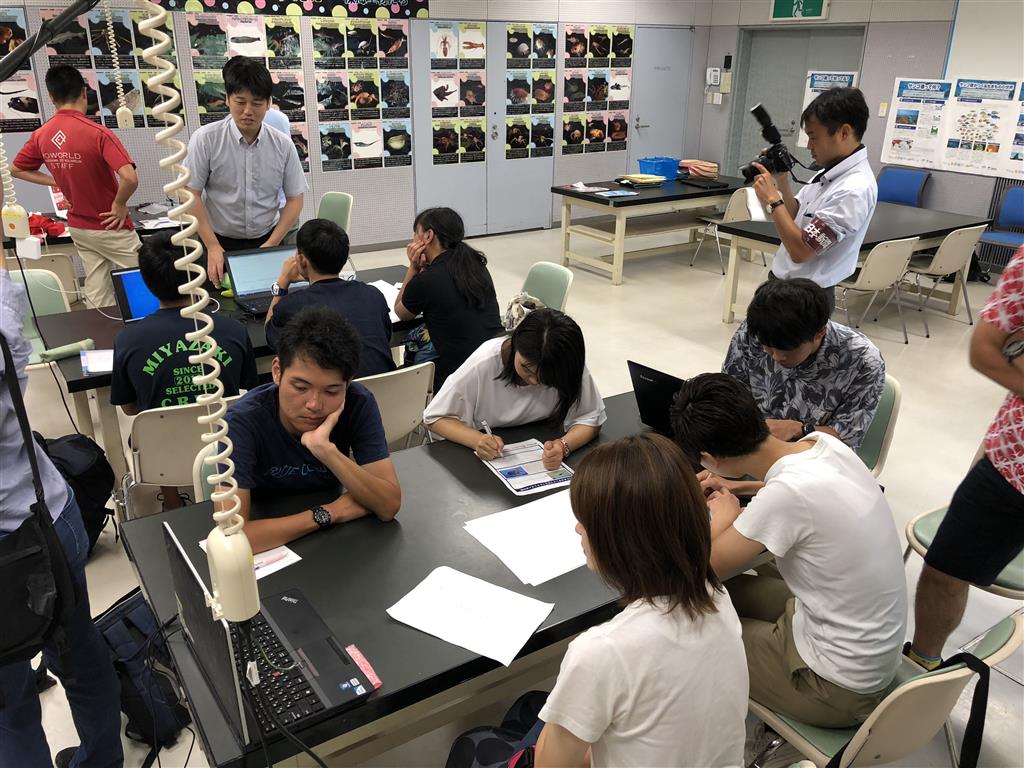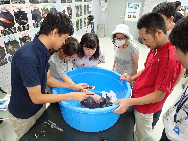 体験教室では、3班に分かれ、バイオロギングの手法でウミガメの行動を探る実験を行いました。各班にウミガメ1匹と調査機材(映像記録計、行動記録計、装着資材)が配布されました。水族館の職員から、ウミガメの形態や生態の解説を聞いた後、班ごとにウミガメの行動を予想し何を調べるかを検討しました。講師の先生の指導を受け、参加者が記録計の設定や容器内を動きまわるウミガメに機器を取り付けました。