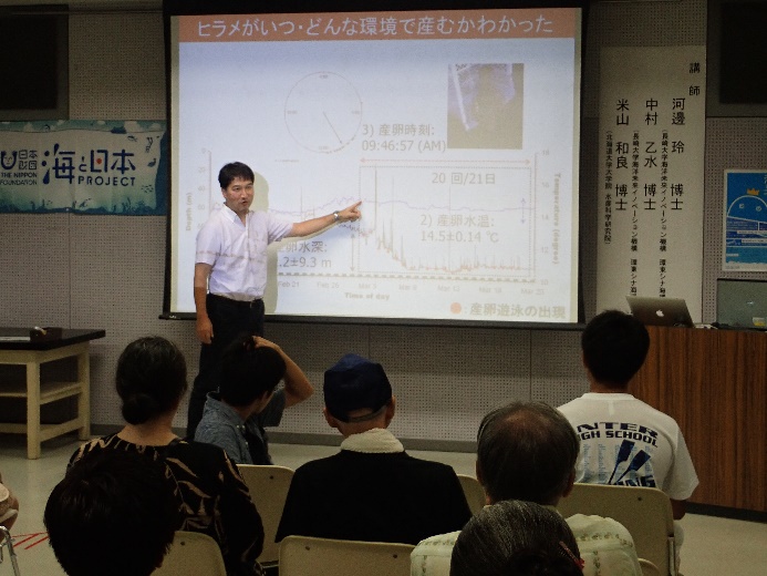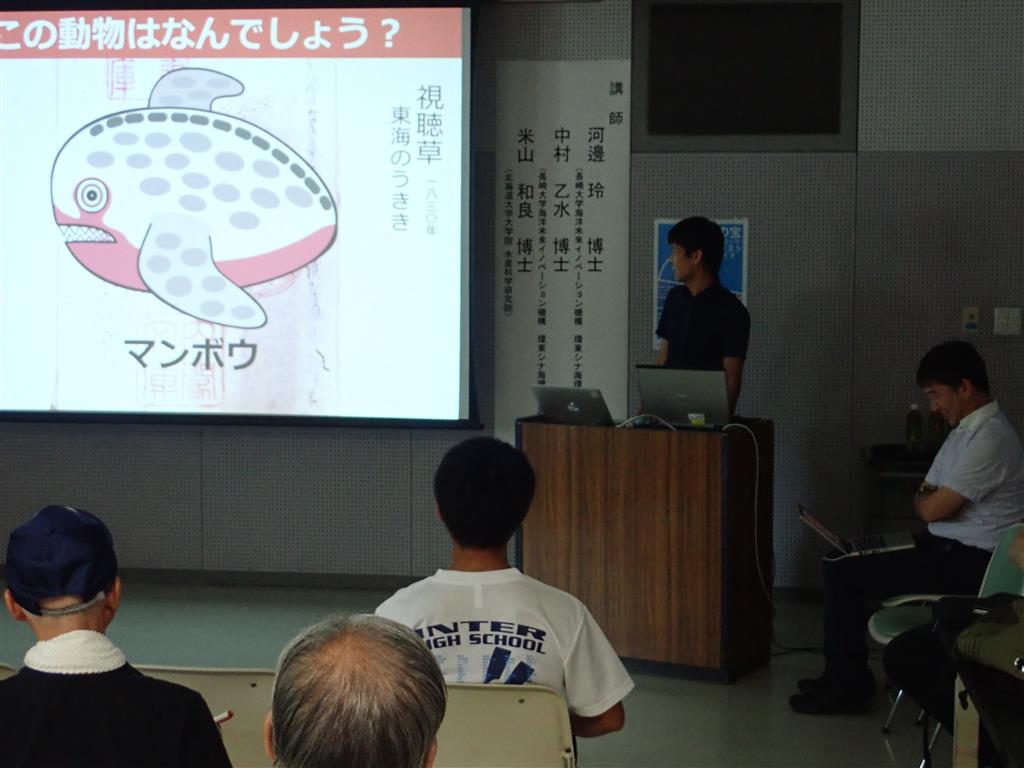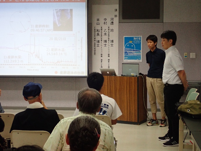 調査の行動記録計から得られたデータをもとに、海中を泳ぐ生物の姿勢や行動、遊泳速度、水深や水温などの生息環境について解説していただきました。それぞれの生物の水槽とは違った自然界でのダイナミックな行動に参加者も驚いていました。動物の行動や生息環境を詳細に知ることができる「バイオロギング」研究の面白さを知る良い機会になったようです。