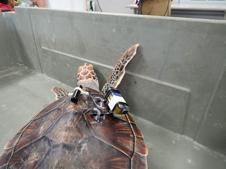 2日目(28日)は、ウミガメに取り付けた記録計を回収し、データの取り出しを行いました。