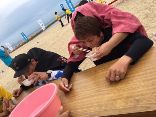 今回のビーチフラッグスは一味違う!地元名産の高級ボロニアソーセージ「雲仙ハム」がなんとフラッグの代わりに!!高級品を争奪するとあってとくにパパママに熱が入りました。