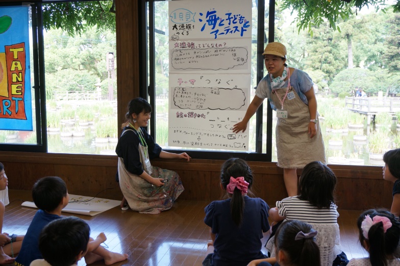 1日目は、大漁旗の制作です。二人のアーティスト岩田とも子さん・松田唯さんアートユニットANDNAとともに、大漁旗の意味を考え、オリジナルの大漁旗をデザインしました。大漁旗のテーマは「つなぐ」です。