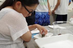 和田先生の説明のもとで、キサゴの貝殻をたくさん入れた水槽に、別のヤドカリを入れてみると、今度はヤドカリが貝殻を丁寧に調べて引っ越す様子が観察できました。