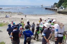 イベントは新和宏分館長のあいさつでスタート。すぐに奥野淳兒先生へと引き継がれ、全員で海岸へ。ここは、かつうら海中公園の横で、右手には海中展望台もあります。勝浦の漁港はキンメダイ漁、サバ漁で賑わい、全国でも1、2を争うカツオの水揚げ地です。その豊かな海で、エビ、カニ、ヤドカリを観察しました。